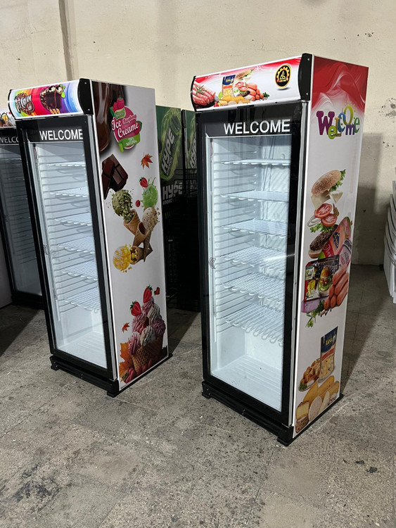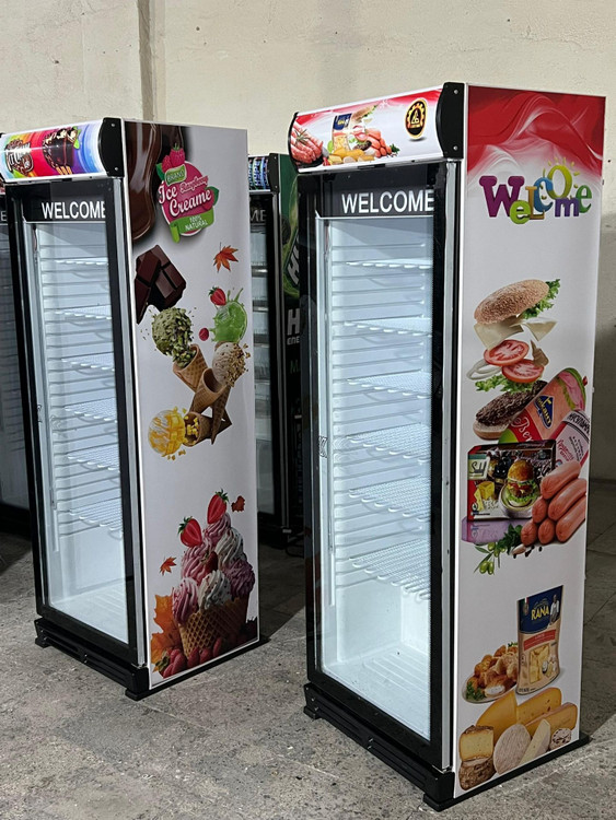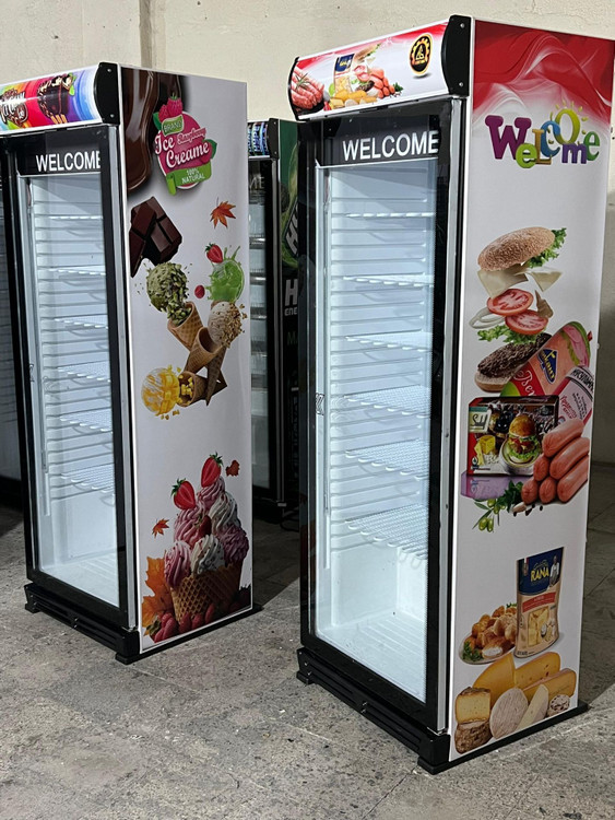فریزر بستنی ایستاده ویترینی عرض 70 سانت تک درب طرح پروتئین و فست فود