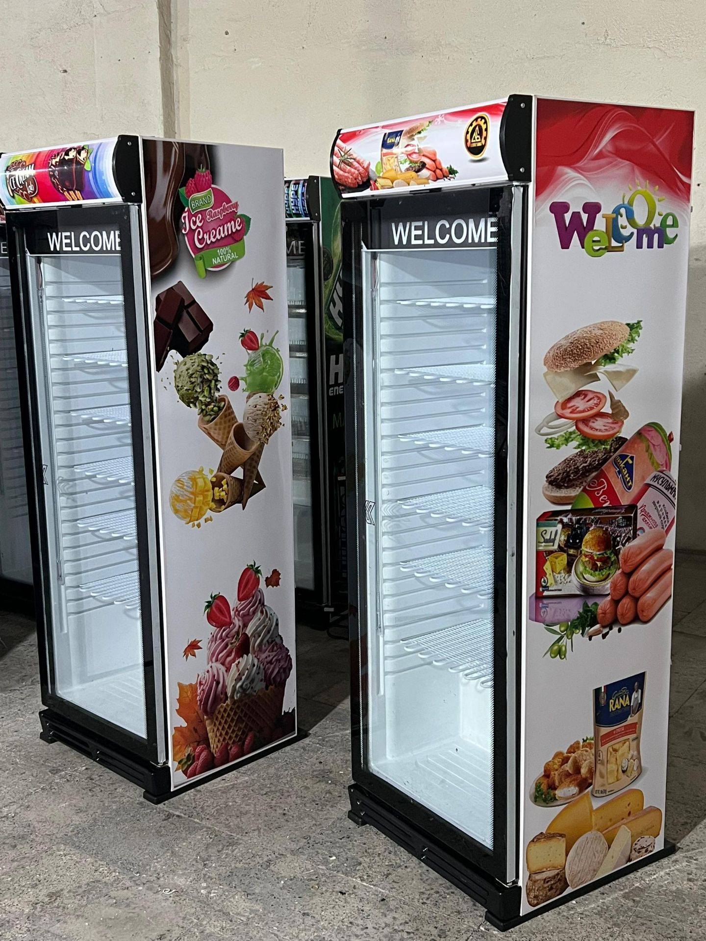 فریزر بستنی ایستاده ویترینی عرض 70 سانت تک درب طرح پروتئین و فست فود